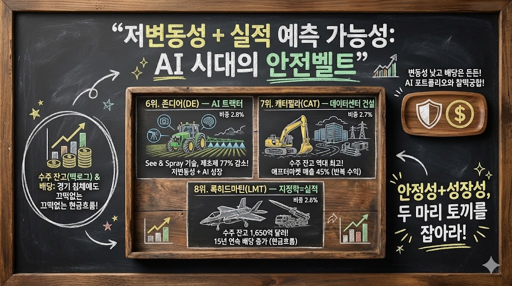 이렇게 배치하면, AI 반도체가 조정을 받더라도 방산(록히드마틴)과 인프라(캐터필라)가 방어해주고, 반대로 경기 둔화 우려가 커져도 AI 성장주가 포트폴리오를 끌어올려 줍니다. 어느 한쪽으로 치우치지 않는 구조예요.