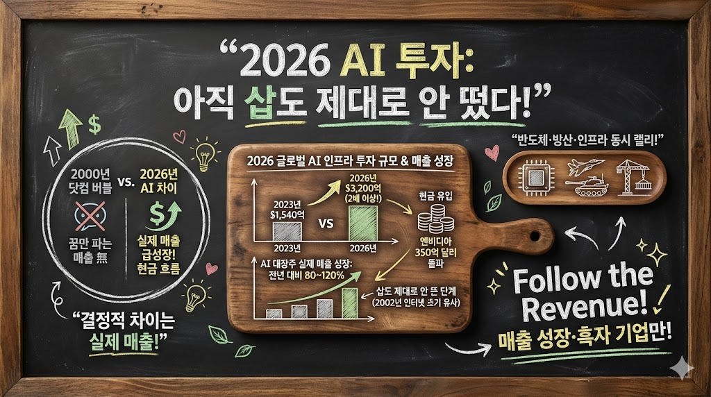 그런데 여기서 정말 중요한 게 있어요. 2000년 닷컴 버블과 2026년 AI 투자 사이클의 결정적 차이는 "매출"입니다. 닷컴 시절에는 매출 없이 꿈만 팔았지만, 지금 AI 대장주들은 실제 분기 매출이 전년 대비 80~120% 성장하고 있어요. 엔비디아의 2025년 4분기 매출은 350억 달러를 돌파했습니다. 꿈이 아니라 현금이 들어오고 있다는 거죠.