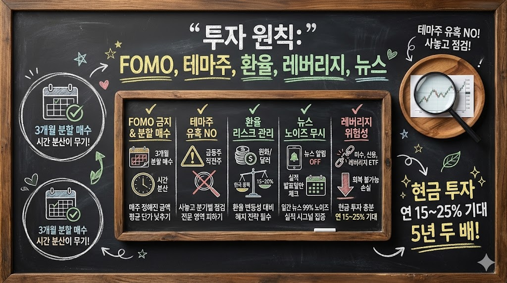 미수거래, 신용거래, 레버리지 ETF. 이런 도구들은 수익을 2배로 만들어주지만, 손실도 2배입니다. 50% 손실이 나면 원금 회복에 100% 수익이 필요해요. 수학적으로 불리한 게임입니다. 현금 투자만으로 충분합니다. 10종목에 분산 투자하면 연 15~25% 수익을 기대할 수 있는데, 이것만으로도 5년이면 자산이 두 배가 됩니다.